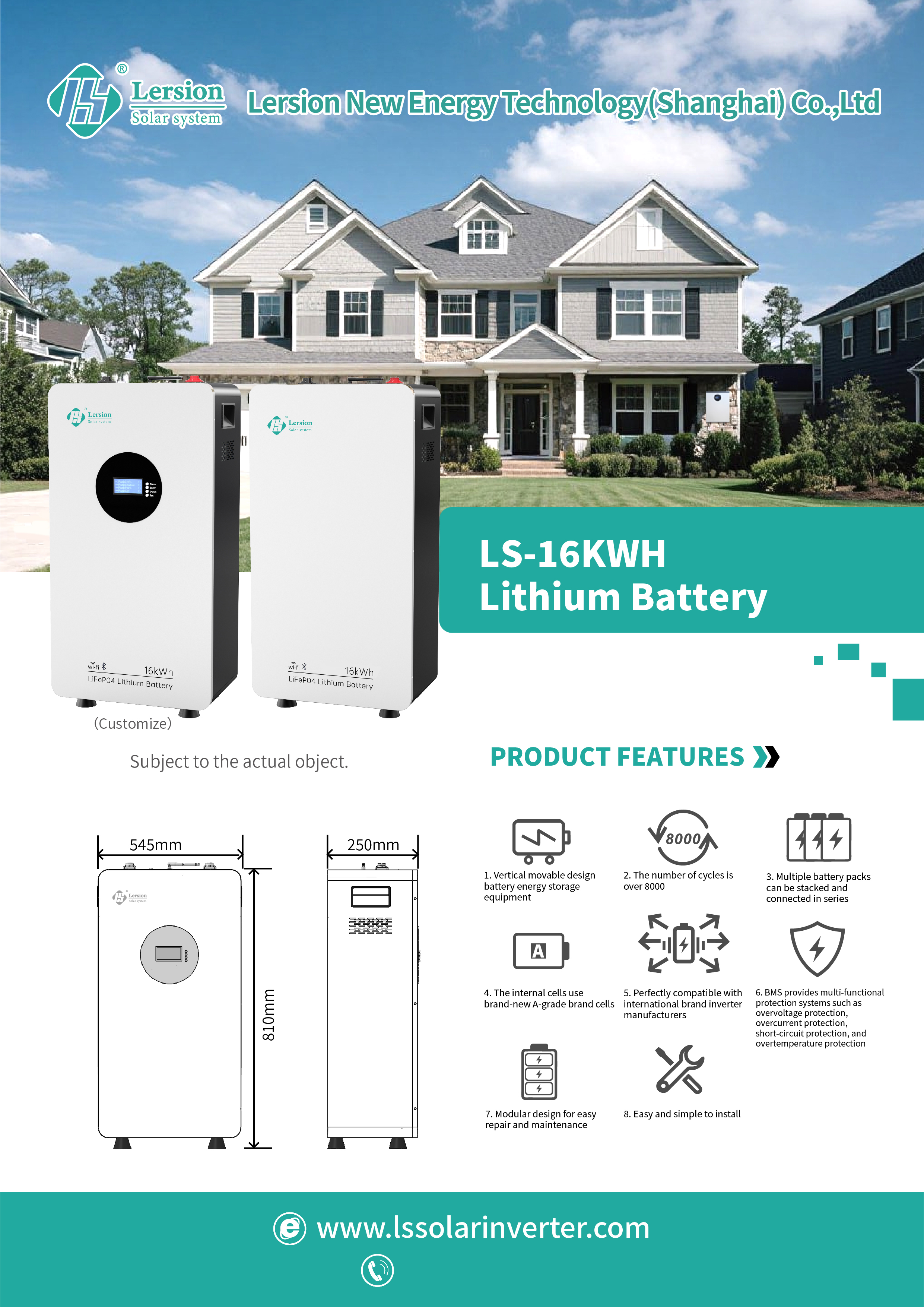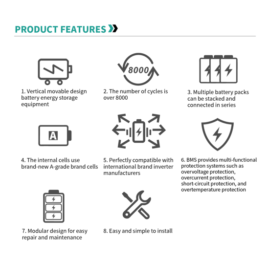 This 16kWh energy storage battery is designed for both home and commercial use, ideal for pairing with solar systems. It adopts safe LiFePO4 battery cells and is equipped with a built-in BMS (Battery Management System) to prevent overcharging, over-discharging, and short circuits.